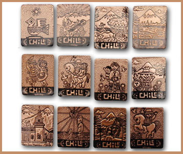 Elaborados en cobre repujado, motivos típicos Chilenos, con iman para adherir a refigeradores y otras superficies metálicas, tamaño 5 x 6 cms.